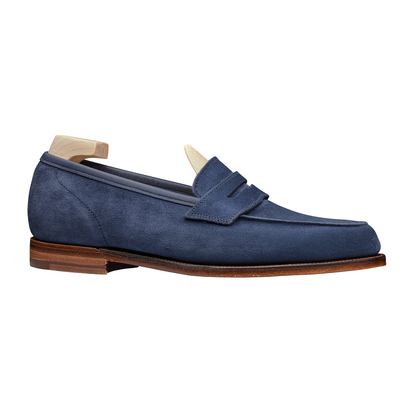 Lilou, an unlined penny loafer with butted seam apron, made from the finest sapphire blue calf suede leather and SUPERFLEX leather soles. From the Women's Collection.
