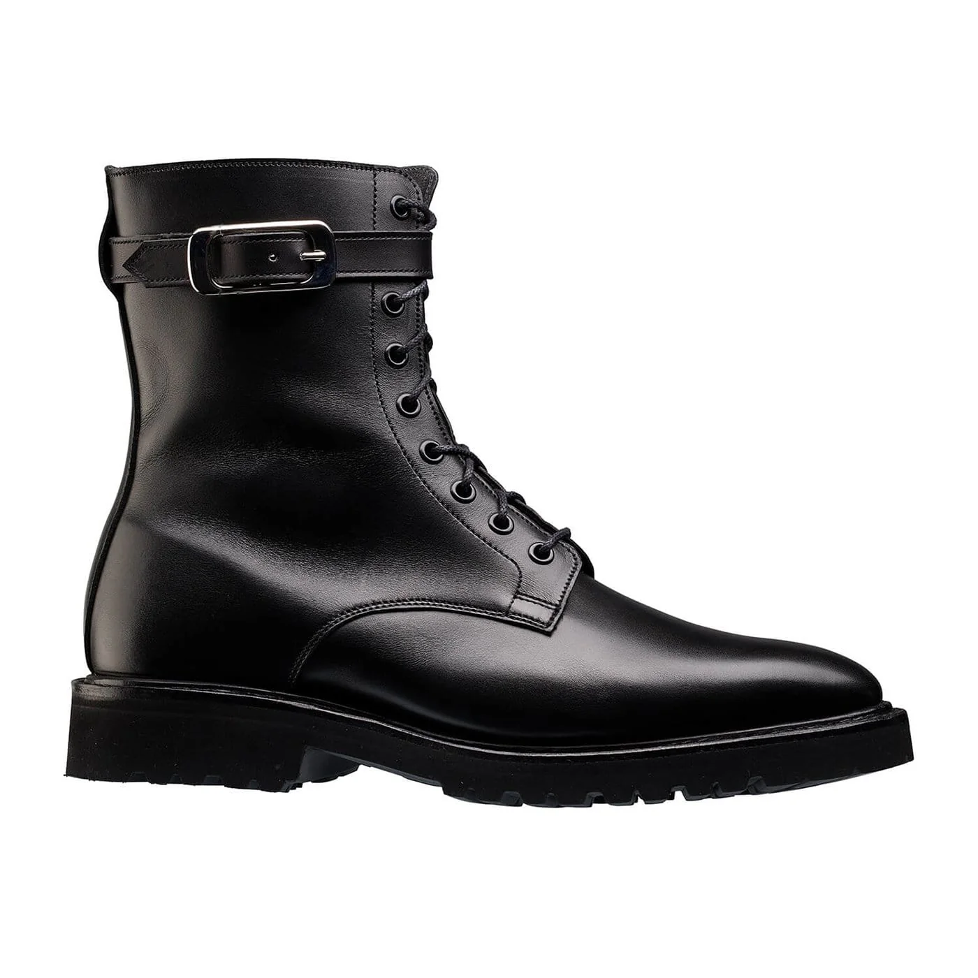 Molly, a high leg derby boot with a buckled ankle strap for added detail. Made from the finest black calf with an oversized lightweight cleated sole. From the Women's Collection.