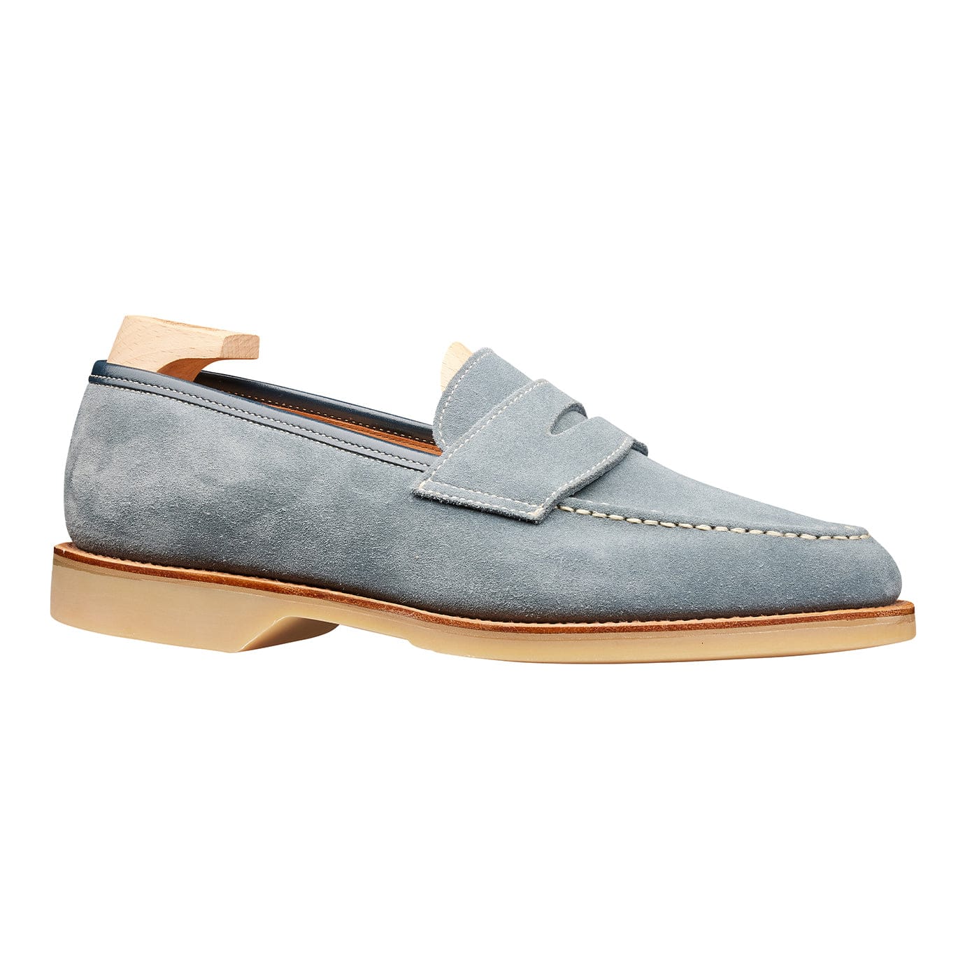 Made in England, using our unstructured construction method, Sorrento features flexi-welts and a lightweight ribbing. To create our most casual loafer, we have removed the toe stiffener and utilised the tight fibre structure of our shoulder insoles to guarantee comfort and longevity in wear. Produced on our shortest loafer last (Last 391), Sorrento is what we would call a 'short-vamp' Penny Loafer. Sorrento is available in Desert, Pistachio and Pastel Blue Suede.